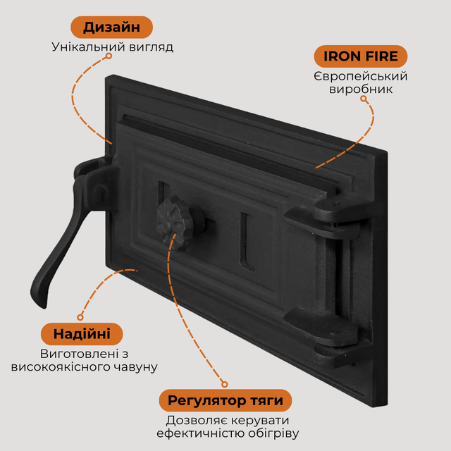 - Різноманіття моделей: У асортименті Iron Fire є дверцята різних розмірів і стилів, що дозволяє підібрати ідеальний варіант для будь-якої печі чи каміна.